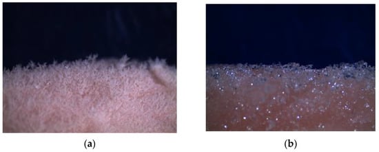 An optical microscopy analysis was performed on the frost formed on the surface and inside of the container where the frozen meat was found. Images were taken with an EZ4D stereomicroscope (Leica, Germany) at 2, 7, and 15 days of storage with the two films (PVC and LDPE); likewise, it was also performed with a stainless-steel plate of 0.10 × 0.10 × 0.01 m. The samples were cooled with liquid nitrogen for 10 min near to −60 °C and after melting the frost. The samples were placed on a blue plate to cause a contrast effect with the Leica Application Suite V3, and a 12.5× approach was applied for a greater focus. Following the methodology of Meléndez et al. [25], images were superimposed to determine the maximum thickness. The frost formed on the stainless-steel plate against a sample of ultra-pure water (UW, Ultrapure Water for HPLC Analysis—METRIX Laboratory, Mexico City, Mexico) was examined to determine if there were differences in specific properties.