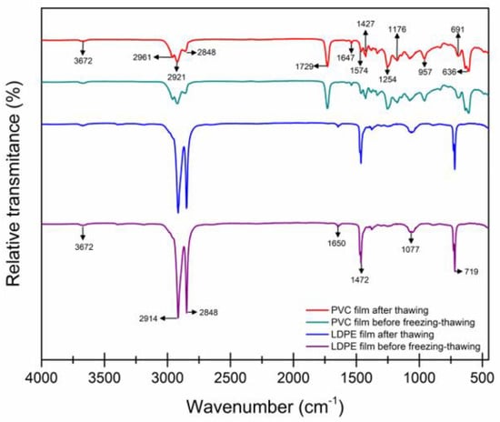 Some precedents confirm structural changes in polymers tested at high temperatures [33,34,35]. The spectra of the plastic films before freezing and after thawing are presented (Figure 3) where no differences were found in the bands; however, there were small variations in the relative transmittance of some bands, indicating that the freezing process in the chamber did not significantly affect the molecular structure of the containers used for this research.