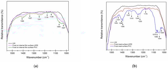 Infrared spectrum of frost water on the (a) surface of LDPE and PVC containers and (b) surface of meat packaged in LDPE and PVC, in contrast to ultra-pure water.