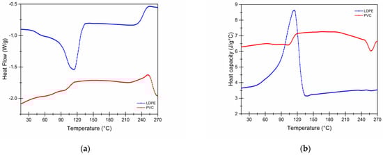 (a) Representative heat flow thermogram (W/g). (b) Specific heat (J/g °C) of PVC and LDPE films.