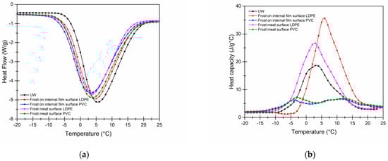 (a) Heat flow (W/g). (b) Specific heat (J/g °C) of frost water from the surface of the packages and meat.