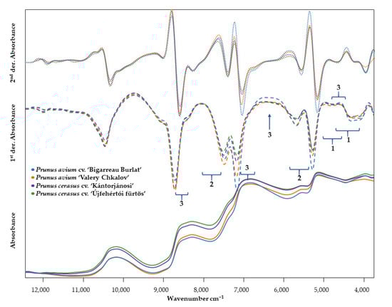 Figure 1 shows the raw spectra of the two varieties of cherries and sour cherries and their first and second derivatives.
