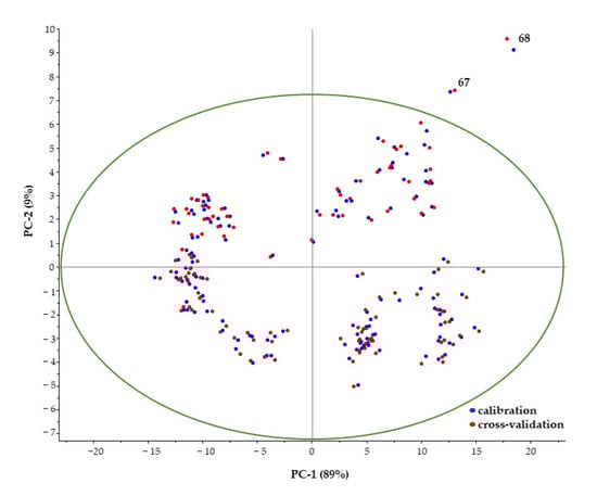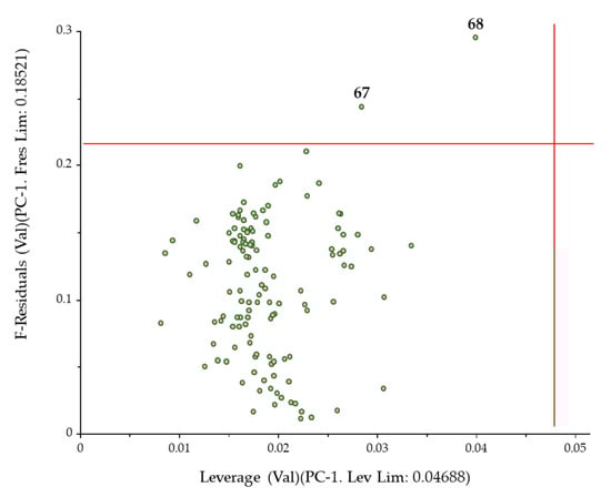 The PCA analysis shows that two samples lie outside the 95% confidence band. To verify that these are true spectral outliers, we need to examine the Leverage–F-residuals relationship (Figure 3). Samples with higher leverages have a stronger influence on the model than other samples; they may or may not be outliers, but they are influential. An influential outlier (high residual + high leverage) is the worst case; it can however easily be detected using an influence plot. Two samples (67 and 68) have high residual, but low leverage. These samples are not extreme in the model; however, they do not fit in the model well.