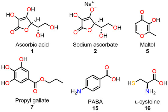 Chemical structures of the six selected scavengers 1, 2, 5, 7, 15 and 16 for evaluation of their N-nitrosation inhibition activity in solid-state experiments. Scavenger 2 was omitted for evaluation in solution experiments.