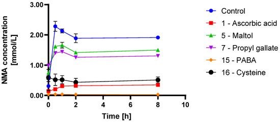 Compared to the control reaction mixtures, all five scavengers decreased the amount of NMA and NPP to some extent. Para-aminobenzoic acid (15) was the most effective scavenger as only traces of NMA and no NPP could be detected in the reaction mixtures (orange curves). Ascorbic acid (1) and l-cysteine (16) were also highly effective in the prevention of NPP formation, as they decreased its concentration by more than 98% compared to the control reaction (red and black curves, respectively). Their activity against MA N-nitrosation was also significant, albeit lower, as shown in Figure 5 (75–90% less compared to control reaction). Propyl gallate (7) was more effective in decreasing the formation of NPP than NMA (purple curves). Maltol (5) was the least effective scavenger as it decreased the amount of NMA and NPP only by approximately 20–35% (green curves).