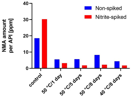 NMA has been detected in all the tablets with MA × HCl before stress testing, with the highest amount of 97.31 ppm and the lowest in 14.47 ppm (Table 3). More NMA was formed in the tablets spiked with nitrite, which was expected. The increase of N-nitrosamine in the non-spiked tablets is probably due to the presence of nitrite in the excipients used [67]. The impact of the scavengers on the N-nitrosation was inconclusive. The only scavenger that decreased the amount of NMA relative to the control tablets in both the non-spiked and spiked tablets was sodium ascorbate (2). Ascorbic acid (1) also slightly decreased the amount of NMA in the non-spiked tablet (by 11.8%) and PABA (15) lowered it in the nitrite-spiked tablet by 15.3%. The other three evaluated scavengers (5, 7 and 16, respectively) increased the NMA amount in both the non-spiked and spiked tablets. The impact was much more obvious in the spiked tablets, where the increase compared to the control tablet was 60.2% for maltol (5) and 188.1% for propyl gallate (7). Further stability tests (data shown in a subsequent section) of NMA were performed at two less stringent stability conditions: 50 °C and 40 °C (moisture excluded by keeping the samples in tightly closed containers).