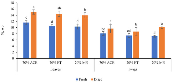 For the extraction yield, statistically significant differences were only found between fresh and dried raw materials, as shown in the Figure 1. Yields in the range 13.9–15.0%, and 10.3–11.6% were found for dried and fresh leaves, respectively and yields in the range of 8.7–10.1%, and 7.2–8.1% were found for dried and fresh twigs, respectively.