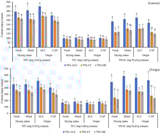 Making an overall analysis of this set of data, significantly higher extraction yields were obtained for dried raw material, and significantly higher TPC, TFC, and TPrAC contents were found in the extracts produced with 70% ACE (except for hot extraction from twigs). The TPC, TFC, and TPrAC contents of twigs extracts with 70% ACE were also higher than those contents in the leaves extracts obtained with the same solvent.