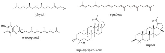 Chemical structures of phytol, squalene, α-tocopherol, lupenone (lup-20(29)-en-3-one), and lupeol.