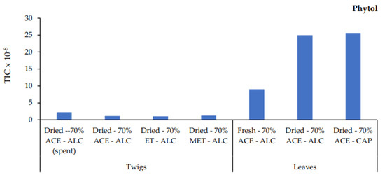 Phytol is a diterpene known for its wide range of biological activities, such as antimicrobial, antioxidant, cytotoxic, anxiolytic, anticonvulsant, immunomodulatory, antinociceptive, and anti-inflammatory activities, besides its role in the induction of apoptosis and protective autophagy and in the treatment of metabolic disorders [79]. Phytol is the most abundant compound in the analyzed extracts, especially in the leaves fraction, with the extracts obtained from dried leaves showing higher content than the one obtained from fresh leaves (Figure 4).