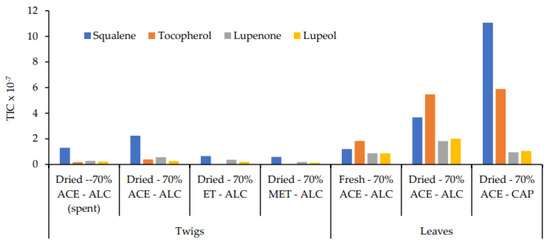 Absolute peak areas of squalene, α-tocopherol, lupenone (lup-20(29)-en-3-one), and lupeol in the analyzed extracts; TIC: Total Ion Current.