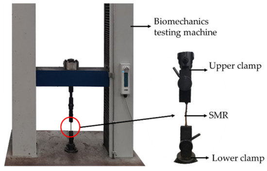 According to previous research results [1,3], the range of Poisson’s Ratio ν of SMR was 0.3–0.4 preliminarily. The volume and mass of SMR with different radii were measured using the drainage method and an electronic balance. The average density ρ of SMR was 266 kg/m3. The elastic modulus E of SMR was one of the critical parameters for establishing a DEM model, and its range can be determined by tensile tests [7]. As shown in Figure 2, the tensile testing equipment used the biomechanics testing machine with model DDL10 and EDC controller (Changchun Testing Machine Research Institute, Changchun, China). During the measurement, two ends of SMR were fixed vertically with a pair of clamps. The upper clamp stretched the SMR axially at a speed of 20 mm·min−1 until it was broken [30]. The elongation was obtained by measuring the distance between the unit gauge length points after a fracture. Due to the SMR with different diameters being similar to round bars, according to Hooke’s law, the relationship between stress σ and strain ε can be obtained as:
