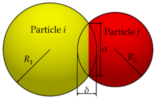 where FJKR is the JKR normal elastic force, N; δ and α are the overlap and radius of two contact particles, respectively, m; and γ is the surface energy coefficient, N m−1. E* and R* were equivalent to Young’s modulus, pa, and radius, m, which can be determined using the following equations: