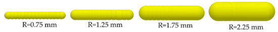 To improve the computer processing speed in the simulation, the model in the current study was simplified, similar to most DEM simulations [1]. Since the AOR test simulation did not involve material bending or fracture, an approximate cylindrical multisphere composed of spheres in aggregation was established to describe the different parts of SMR. Figure 5 shows four SMR segments with different radii created for calibration experiments of contact parameters. The length of every SMR model is set to 15 mm to ensure the particles can fall smoothly in the AOR test [21].