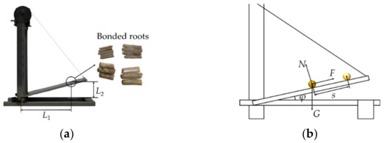 Referring to the research methods of Liu et al., the slope-sliding test was used to determine the static friction coefficient μs range of SMR-SMR, SMR-steel, and root-soil. In order to ensure that the movement of SMR was only sliding on the slope, a number of them were bonded as a single sample [23]. Every sample was placed on the plate of the test bench as shown in Figure 7a. The distance between the initial position and bottom rotation axis was recorded as L1. The plate plane was raised slowly around the rotation axis until the sample slid on the plate. The height of the final position was measured as L2. The μs can be calculated by:
