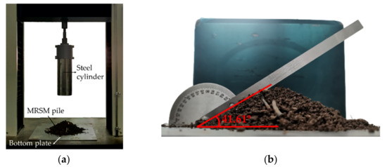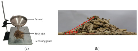 According to previous research on the AOR of plant stalks, the AOR test of SMR was carried out by the injection method shown in Figure 8a [28]. Before the measurement, SMR was prefabricated into four particle samples with a length of 15 mm and a diameter of 1.5, 2.5, 3.5, and 4.5 mm, respectively. Each sample with a mass of 2.5 g in equal proportions was mixed evenly. Then, the mixed SMR samples were poured into the funnel with an outlet (100 mm height × 25 mm inner diameter) and injected uniformly within 2 s. The AOR of the root pile was measured after all samples were stably piled on the receiving plate (300 mm length × 300 mm width). This experiment was repeated ten times, the average AOR θR of the SMR pile was 32.29 ± 0.8758°, and the coefficient of variation was 2.71% (Figure 8b).