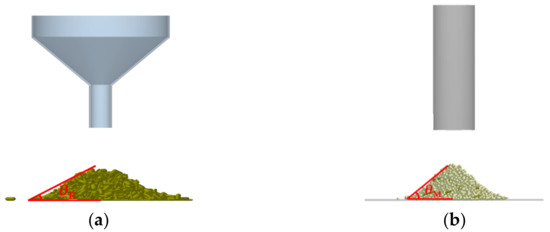 The discrete element models of AOR test for SMR and MRSM were developed using EDEM2020, respectively (Figure 10). For the SMR, a particle factory was created above the funnel, and four different diameters of SMR with a total amount of 12 g were generated dynamically at a speed of 6 g/s. The particles were given an initial velocity of 2 m/s to ensure the SMR fell rapidly and smoothly. When all the SMR particles were deposited on the bottom plate, the AOR of pile was measured and recorded by the protractor tool in the post-processing module. The total simulation test time was 6 s, and the Rayleigh time step was 2.3 × 10−6 s.
