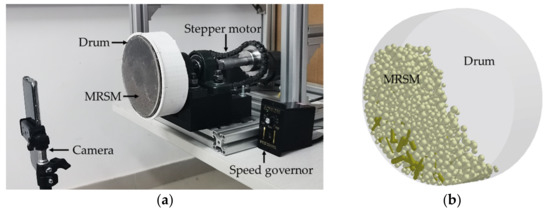 The rotating drum test of MSRM. (a) Measurement; and (b) Simulation.