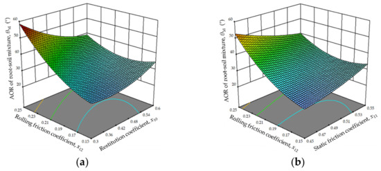 Effects of interaction on the AOR of MRSM: (a) the interactive effects of the rolling friction coefficient and restitution coefficient of root-soil; and (b) the interactive effects of the rolling friction coefficient and static friction coefficient of root-soil.