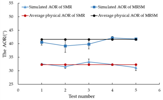 The AOR of SMR and MRSM in simulations based on the optimized parameter combinations were carried out, respectively. From Figure 13, the average value of simulated AOR on SMR and MRSM was 32.18° and 40.71°. An independent sample t-test was performed on the simulated and physical test values. For the SMR, the results showed Pt = 0.761 > 0.05, and the relative error was 0.34%, indicating the calibrated model can accurately simulate the AOR of SMR. For the MRSM, the results showed Pt = 0.181 > 0.05, and the relative error between the simulated and measured AOR was 0.22%, indicating that the DEM parameters of MRSM were reliable.