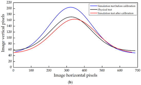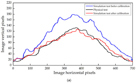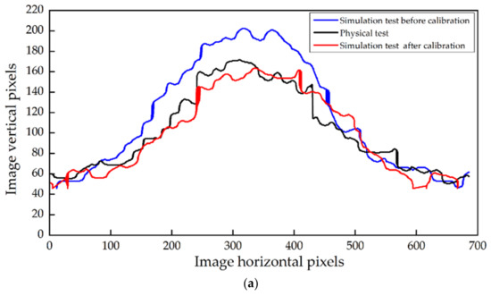 The edge detection method of the Canny Operator was used to extract the contour of the material pile in the experiment and simulation experiment. The contour fit curve exactly showed the difference between the model and the actual value. This method not only considers the AOR of the material but also quantitatively compares the material pile as a whole structure, which further verifies the accuracy of the calibration results. The contours of the original stack were extracted through gray-scaled treatment, and boundary extraction was conducted using Python based on the Canny operator algorithm (Figure 14). Figure 15a compares the simulated and physical contour of the SMR pile. The pixel distribution of the three curves was consistent with the actual image, and the coincidence of the simulated test and the actual test profile curve after calibration is higher than before. Via fitting the contour curve with Gaussian distribution, the three curves’ vertical pixel peak serves were 204.218, 164.048, and 171.472, respectively (Figure 15b). The pixel peak error of the simulation test after calibration and the actual test was 4.33%. It further showed that the calibrated contact parameters effectively improved the reliability of the AOR test model.