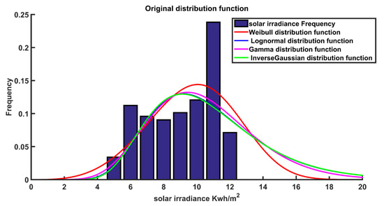 In this case, four original PDFs are shown. Table 4 shows the statistical errors and the PDFs’ parameters for the four PDFs using the MA approach. The Weibull distribution gives the best outcomes because it has the lowest RMSE and X2 and the highest R2. The fitting of the four original PDFs with the solar irradiance frequency distribution is shown in Figure 5, with the Weibull distribution having the best fit. It is evident that the Weibull distribution decreases the RMSE by 7%, 10%, and 11% compared with the Gamma, Lognormal, and Inverse-Gaussian distributions, respectively.
