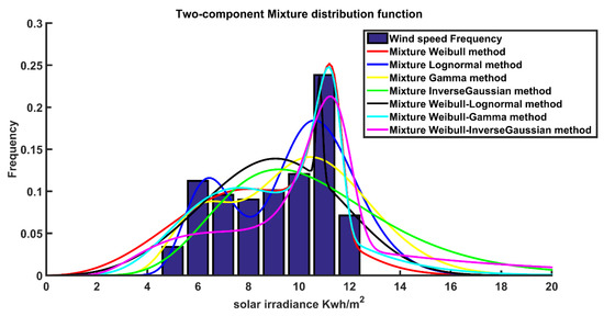 Seven two-component mixtures of distribution functions are investigated in this scenario to determine which curve best fits the solar irradiance frequency distribution. Table 5 shows the seven mixtures of the PDFs being studied combined with their optimal parameters and statistical error calculations. The two-component mixture of the Weibull and the Weibull–Gamma mixture of PDFs produces the best results because it has the lowest RMSE and X2 and the highest R2. Furthermore, the results demonstrate that the statistical error estimations of the two-component mixtures of PDFs are superior to the four original distribution functions. Figure 6 shows the fitting of the seven two-component mixtures of PDFs to the solar irradiance frequency distribution. It is evident that the two-component mixture of the Weibull and the Weibull–Gamma mixture decreases the RMSE by 67%, and 70%, respectively, when compared to the Weibull distribution.