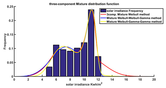 The three-component mixtures of PDFs are utilized to model solar irradiance frequency distribution in order to enhance the statistical error calculations. Among the original and two-component mixture distributions, the two-component mixture of the Weibull and Weibull–Gamma PDFs has the best fitting criteria for solar irradiance, as shown in the previous section. Therefore, in this case, we study the three-component mixtures of the Weibull, Weibull–Weibull–Gamma, and Weibull–Gamma–Gamma. Table 6 shows the three-component mixture of the PDFs being studied combined with their optimal parameters and statistical error calculations. Figure 7 shows the fitting of the three-component mixtures of PDFs to the wind speed frequency distribution. The three-component mixture of the Weibull–Gamma–Gamma PDF gives the best outcomes because it has the lowest RMSE and X2 and the highest R2. The results also reveal that the statistical error calculations of the three-component mixtures of PDFs are better than the four original distributions and the seven two-component mixtures of distribution functions. From the results, it is evident that the three-component mixture of Weibull–Gamma–Gamma decreases the RMSE by 73%, 17%, and 9%, when compared to the distributions of the Weibull, the two-component Weibull, and the Weibull–Gamma mixture, respectively.