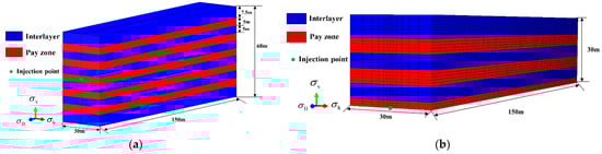 Scholars at home and abroad have studied the pattern of HF propagation in layered strata based on physical model experiments and numerical simulations [5,6,7,8,9,10,11,12,13,14,15]. Mukhtar et al. (2022) [5] present a coupled multiphysics 3D generalized finite element method to simulate hydraulic fracture propagation. This method is validated against a hydraulic fracture experiment on PMMA. There are two types of factors affecting vertical HF propagation: formation factors and treatment parameters. The former include interlayer stress contrast, petrophysical property, and tensile strength, while the latter include pump injection rate and fracturing fluid viscosity (Tan et al., 2021; Sun et al., 2020; Tan et al., 2019) [6,7,8]. Miskinmins et al. (2003) [9] studied the influence of interlayer properties of sand and mud on vertical HF propagation and analyzed the influence of interlayer interface shear slip, rock mechanical properties difference, and pore elasticity on HF height propagation. Li et al. (2014) [10] studied the HF propagation pattern in layered strata based on the finite element method, and the results showed that the high stress, high strength, and low modulus significantly inhibited the vertical HF propagation, thus the HF height can be controlled. Sun et al. (2020) [7] established a multi-layer HF propagation model based on the cohesive element theory, and the variation in the angle of the relative vertical extension of the bedding plane and the tensile strength of the bedding plane on the vertical extension of the HF is analyzed. The simulation results show that reservoirs with low vertical stress differences and nearly horizontal bedding planes with low dip angles are found to be favorable for opening the bedding planes, and reservoirs with high vertical stress differences and bedding plane dip angles are favorable for the longitudinal expansion of HFs. Wang et al. (2021) [11] conducted triaxial fracturing simulation experiments on full-diameter shale cores with different horizons to study the vertical propagation patterns of HFs in different reservoirs and established a pseudo-three-dimensional HF propagation model of multi-layer shale oil reservoirs. The results show that the HF height of shale is smaller than that of sandstone owing to bedding limitations. When sandstone and shale are fractured at the same time, the HF extension height reaches the maximum after the two layers are connected. When the sandstone–shale interface is strong, increasing the pumping rate can increase the HF height. Fu et al. (2021) [12] studied the effect of permeability difference, in situ stress condition, and lithological interface on hydraulic propagation by building a 3D HF propagation numerical model. The results show that the ability of HF to cross the lithologic boundary decreases with the increase in the high permeability difference coefficient. In addition, when the stress difference between layers is small, the fracture penetration boundary has a higher probability to expand to the additional layer. Liu et al. (2022) [13] considered the Hancheng area, Ordos Basin, China, as an example to understand macrolithotype differences, established finite element numerical models of the cohesive zone, and evaluated the HF initiation and vertical propagation behavior of laminated coal reservoirs. Mukhtar et al. (2022) [14] present a comprehensive study on multiple hydraulic fracture propagation and their interactions under different treatment conditions. A systematical parametric study was carried out and the considered factors included fracture spacing, injection fluid viscosity, number of fracture clusters, and the stress conditions.