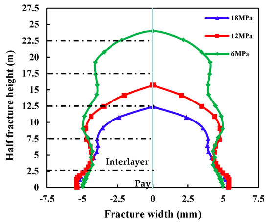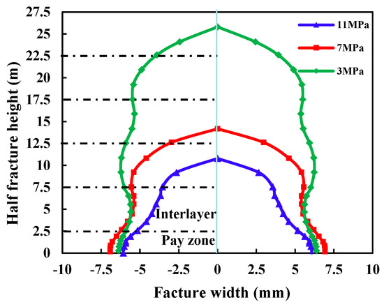 Based on the parameters in Table 1, the minimum horizontal principal stress of the pay zone was set as 20 MPa and kept unchanged, the minimum horizontal principal stress of the interlayer (23 MPa, 27 MPa, 31 MPa) was set successively, and other parameters were kept consistent. The variation law of HF height and width was studied under the interlayer stress contrasts of 3 MPa, 7 MPa, and 11 MPa, respectively. As shown in Figure 3 (injection time of 30 min), the vertical distribution profile of HF width is drawn with the HF center as the coordinate origin. The ordinate represents the half-HF height and the abscissa represents the HF width. It can be seen that, as the stress contrast between layers increases, the HF height decreases. When the stress contrast between layers is 3 MPa, 7 MPa, and 11 MPa, the corresponding HF heights are 25.80 m, 14.18 m, and 10.80 m, respectively, which decrease by 58.14%. The reason is that, the higher the stress in the interlayer, the more difficult the vertical HF propagation, and the higher the net pressure in the HF. For the same volume of injected fluid, the HF tends to propagate along the HF length in the pay zone owing to the strong containment of the interlayers. In addition, compared with the interlayer stress contrast of 3 MPa and 7 MPa, the difference in HF height is 45.04%. Compared with the stress contrast of 7 MPa and 11 MPa, the difference in HF height is 23.84%. Therefore, with the increase in stress contrast between layers, the decrease in HF height becomes slower. The reason is that, the higher the stress contrast between layers, the higher the energy consumed when the HF propagates vertically through the interlayer and the easier it is to stop the HF in the interlayer, and the smaller the HF height, the smaller the gap.