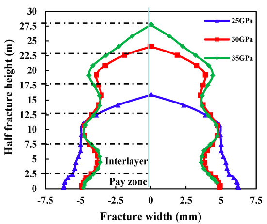 Young’s modulus of the reservoir rock reflects the deformation resistance of the rock and then affects the HF height and width. Young’s modulus of the pay zone was kept unchanged at 20 GPa, and Young’s modulus of the interlayer was set to be 25 GPa, 30 GPa, and 35 GPa, respectively. Other parameters were kept consistent. The variation law of the HF height and width of the HF was studied under Young’s modulus differences of 5 MPa, 10 GPa, and 15 GPa. As shown in Figure 4 (injection time of 30 min), the HF heights corresponding to Young’s modulus of 25 GPa, 30 GPa, and 35 GPa are 15.92 m, 24.11 m, and 27.80 m, respectively, with an increase of 42.73%. The higher the Young’s modulus of the interlayer, the stronger the vertical propagation ability and the higher the HF height. The reason is that, in the interlayer with a high Young’s modulus, the rock deformation is small, the HF width is small, the net pressure in the HF is high, and the vertical propagation ability of the HF is strong. In addition, compared with 30 GPa and 25 GPa, the gap in height was 33.97%. The gap between Young’s modulus of 30 GPa and 35 GPa was 13.27%. Therefore, with the increase in Young’s modulus of the interlayer, the increase in the HF height becomes slower.