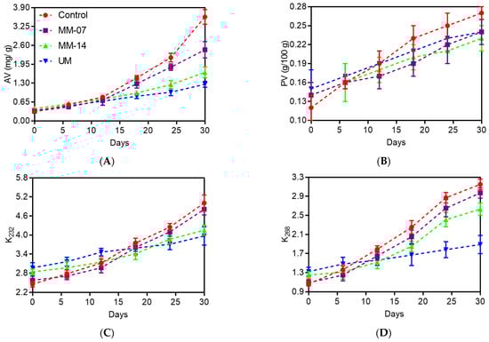 The variation in the levels of AV (A), PV (B), K232 (C) and K268 (D) in the accelerated storage at 65 °C for 30 days. Control: SFO sample produced by the cold-pressing method; MM-07: SFO sample produced by a maceration procedure for 7 days; MM-14: SFO sample produced by a maceration procedure for 14 days; UM: SFO sample produced by an ultrasound-assisted maceration for 10 min.