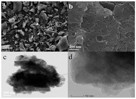The surface morphology and structure of the CLR-based carbon materials were analyzed and studied by SEM and TEM characterization as shown in Figure 2. Figure 2a is the SEM image of the original CLR, showing that the CLR had a non-porous structure on the surface, and Figure 2b is the SEM image of the CLR-PC after activation and high temperature carbonization with the template and alkali, where the surface had a disordered pore structure of different sizes, which facilitates the transfer of electrons on the electrode surface. In addition, the material had a significant honeycomb-shaped porous structure, indicating that the activation of strong bases was effective in deriving more developed pore structures. The TEM images of the CLR-PC (Figure 2c,d) further confirmed the porous structure of the CLR-PC material, which was consistent with SEM image.