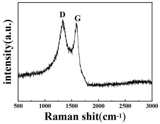 Figure 3 shows the Raman spectra of the prepared CLR-PC samples. It shows a D and G peak at 1347 cm−1 and 1591 cm−1 respectively. This represents the characteristic absorption peak of disordered carbon and an ordered graphite structure. The peak intensity ratio (ID/IG) of peak D and peak G represented the graphitization degree of the carbon material. The ID/IG of CLR-PC was calculated as 1.04, indicating that it had a certain graphitization degree. The sample used as the electrode material had good electrical conductivity and a highly rated performance [].