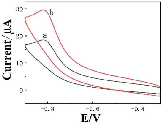 Cyclic voltammograms of 100μmol·L−1 4-NP of bare GCE (a) and CLR-PC/GCE (b) in 0.1 mol·L−1 phosphate buffer (pH = 6).