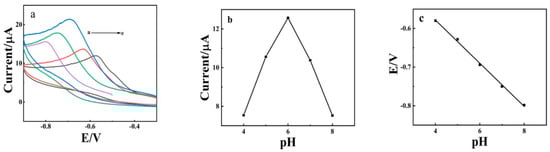 The effect of pH on the electrochemical detection capabilities of the electrochemical sensor towards 4-NP in 0.1 M PBS was investigated across the pH range of 5.0~9.0. (4.0, 5.0, 6.0, 7.0 and 8.0). It can be seen from Figure 8a that when the pH increased from 4.0 to 8.0, the peak current increased and then decreased, and the maximum value occurred at pH = 6. Therefore, a 0.1 mol·L−1 PBS buffer solution with pH = 6 was selected as the electrolyte solution. Figure 8c shows that, with the increase in pH, the reduction peak potential Epc gradually shifted to the negative direction, and there was a linear relationship between the pH and peak potential. The regression equation is expressed as Epc (V) = −0.3552–0.0558 pH (R2 = 0.997), and the slope of the line −55.8 mV pH−1 was close to the Nernst equation at room temperature −59 mV pH−1, indicating that the electrode reaction process of 4-NP on the modified electrode involved an equal number of protons and electrons [].