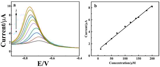(a) DPV responses of CLR-PC/GCE in 0.1 mol·L−1 PBS (pH = 6.0) containing different concentrations of 4-NP (10–200 μmol·L−1). Scan rate: 100 mV·s−1. (b) The calibration plot of peak current versus concentration.