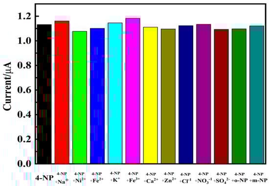 In order to investigate the selectivity of the CLR-PC/GCE, several common metal ions, inorganic anions and p-NP-like organic compounds were investigated in a certain concentration in this experiment. A total of 1000 μmol·L−1 of Na+, Ni+, K+, Fe2+, Fe3+, Ca2+, Zn2+, Cl−1, PO42−, NO3−, SO42−, o-nitrophenol, resorcinol and phenol were detected simultaneously with 4-NP (10μmol·L−1). As seen from Figure 10, different interfering substances had a tiny influence on the peak current of 4-NP in the DPV detection, and the relative standard deviation (RSD) of the DPV response signal was calculated as 2.939%, indicating that the sensor had more resistant to interference.