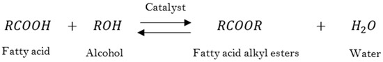 An esterification reaction (Figure 1) consists in the reaction between FFAs and an alcohol, usually methanol, under the presence of a catalyst (most commonly sulfuric acid) leading to the production of methyl esters (biodiesel) and water.