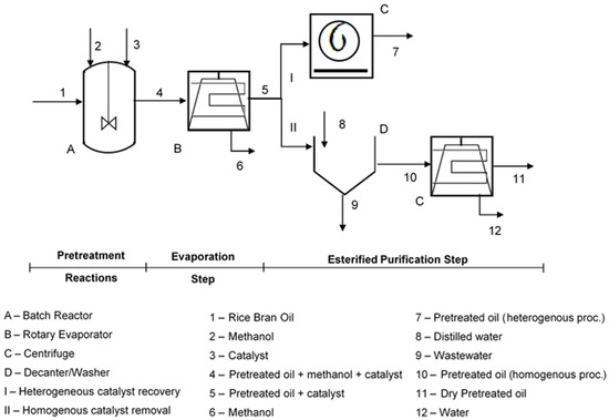 Rice bran oil (mostly constituted by C18:1 ≈ 46 wt.%; C18:2 ≈ 39 wt.% and C16:0 ≈ 11 wt.%; 883 g/mol) was submitted to heterogeneous and homogenous catalyzed esterification. Figure 2 shows the schematic procedure adopted for rice bran oil pretreatment.