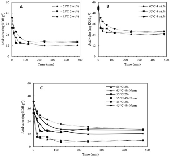 Among all the experimental conditions studied, the lowest acidities were obtained for the temperatures of 55 °C and 65 °C using a 4 wt.% catalyst concentration (Figure 3C—similar results).