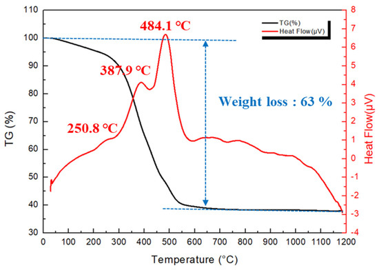 The TG-DSC curve of the ceramic green body fabricated by the DLP 3D printer is shown in Figure 2. First, an endothermic reaction gradually increased from 25 °C to 200 °C, as seen in the DSC curve. Then, distinct endothermic peaks were observed at 250.8 °C, 387.9 °C, and 484.1 °C. The main range for thermal decomposition of the binder was found to be 250–485 °C. The TG curve shows that the mass of the sample decreased with the increasing temperature. The mass gradually decreased in the range of 25–300 °C, with the most significant decrease observed between 300 and 550 °C. After that, the mass change rate decreased steadily. It was observed that the mass tended to decrease by approximately 63% compared with that before heat treatment at 600 °C. The loss of mass corresponded to the decomposed photosensitive polymer and binder in the slurry, as confirmed by Fourier transform infrared (FTIR) spectroscopy.