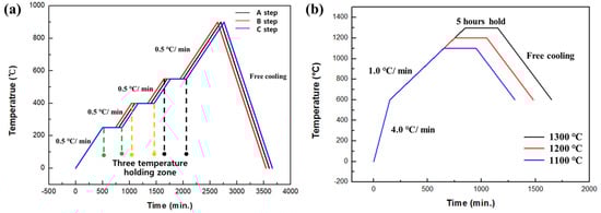 Debinding (a) and sintering (b) profiles. (A step: 4 h, B step: 5 h, C step: 6 h, “step” refers to the three temperature holding zone times).