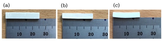 Photographs of the bodies in each stage: (a) green bodies, (b) debinded (6 h holding time) bodies, and (c) sintered bodies at 1300 °C.