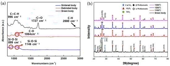 The chemical structures of the three samples (green body, debinded body, and sintered body) were characterized by the FTIR spectrum. In the case of the green body, the absorption peaks at 996, 1727, and 2880 cm−1 can be attributed to the acrylate groups. After debinding, the acrylate groups’ peaks became weaker, indicating that binders were removed after the thermal decomposition. Moreover, the absorption peak at 1064 cm−1 can be assigned to the C-O group of the calcium carbonate (CaCO₃) [17]. In the case of the sintered body, the absorption peaks at 899 and 1146 cm−1 can be attributed to wollastonite and Quartz (SiO₂), respectively [18,19].