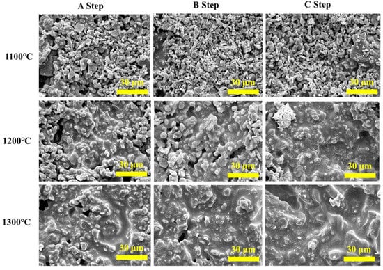 Cross-sectional SEM images of ceramic bodies according to different temperatures with debinding steps A, B, and C.
