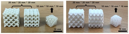 Figure 9 shows the complex lattice structure resulting from the debinding and sintering processes with optimized conditions for ceramic green bodies fabricated by the DLP 3D printing method. Accordingly, the possibility of fabricating structures with complex geometries by DLP 3D printing using the optimized debinding and sintering processes was presented. Finally, DLP 3D ceramic printing technology has high precision and excellent thermal stability of ceramics. Therefore, high-performance products such as high-efficiency microturbine rotors and high-temperature microreactors are currently manufactured in real industry. Microturbine rotors and high-temperature micro-reactors require excellent thermal stability and mechanical properties. In order to obtain these characteristics, we require the development of optimization of ceramic slurry between ceramic powder and resin. Recently, the developed ceramic slurries have consisted of high purity ceramic powder of about 99%. Moreover, the ceramic slurries have been developed by optimizing the ceramic concentration in the slurry to increase the photo-curing efficiency.
