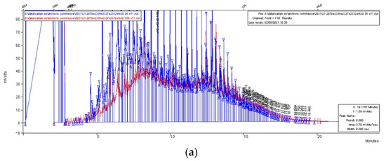 The concentrations of the chlorophylls and pigments were analyzed to confirm the transition of the culture metabolism. The results showed a reduction in the chlorophylls in the culture grown with crude oil, with organic carbon available for their metabolism. However, in the control culture, the production of chlorophylls increased due to the lack of organic carbon in the media and the photosynthetic reaction was optimized (Figure 2a) [20,27]. In addition, the extracted pigments seen in Figure 2b showed a lower production in the mixotrophic culture including those predisposed to the defense of the cells against a stressful agent (e.g., astaxanthin).