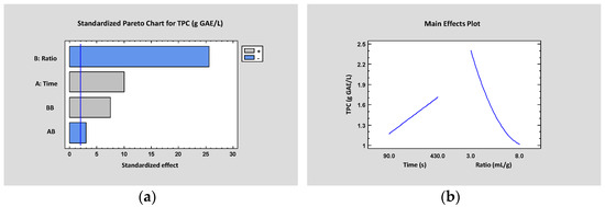 Figure 1a shows that the Ratio variable is the most significant one in the UAE, followed by the Time variable. Ratio is a variable with a negative effect since when its value increases, the extraction is lower. Instead, the variable Time has a positive effect, indicating that the longer the process, the higher the extraction of polyphenols. In Figure 1b we see graphically the effects on the extraction of polyphenols. As has already been said, by decreasing the ratio we obtain a much higher total amount of polyphenols than in the experiments carried out at a higher ratio. This may be due to the concentration of antioxidant compounds since if we experiment with a higher ratio, the mass of residue is smaller and, therefore, the concentration of polyphenols will be reduced. Thus, it is not the consequence of the quantity of phenols, but rather of the dilution in which the sample to be treated is found.
