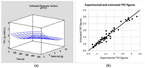 Considering the results obtained by the ANOVA test and the effects of the variables on the process, the design of experiments using the response surface predicted the optimal conditions: Time: 490 s; Ratio: 2.1; pH: 5.6 to achieve maximum extraction of 3.42 g GAE/L (Figure 2a) The R-squared statistic obtained from the model indicates that 94.99% of the variability obtained is determined by the variables of Time and Ratio, therefore, there was not any high intrinsic variability from the olive pomace sample (5%). In Figure 2b, representation of the experimental and the estimated TPC figures is shown. A good correlation between both groups of data can be observed being the mean absolute error (MAE) of 0.099.